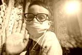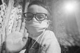 child in quarantine because of a virus sits at home in a mask and looks out the window on a sunny day.Coronavirus and Air pollution pm2.5 concept. COVID-19