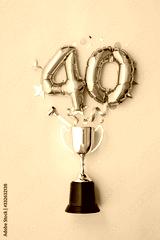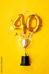Number 40 gold anniversary celebration balloon exploding from a winning trophy