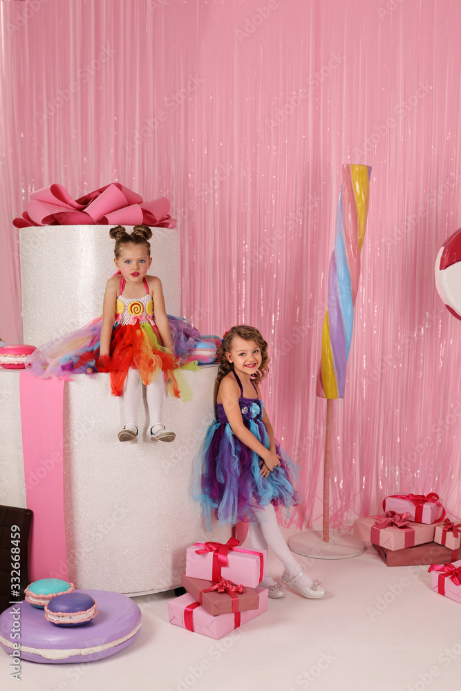 girls-models have fun at a birthday party in a beautiful, delicious, pink candy interior, the concept of themed children's parties, holidays, participation in competitions.