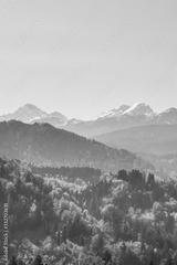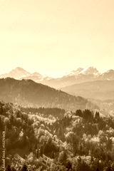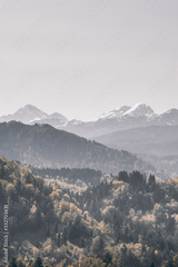 View Of Mountains In Autumn / Panoramic View Of Brown Forest / Hazy Landscape
