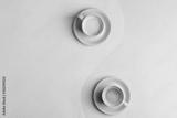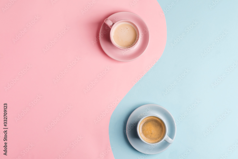 Creative pastel blue pink background as a symbol of infinity with two ceramic cups of freshly brewed coffee drink.