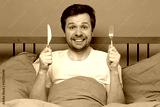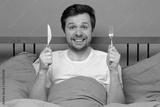 Man is hungry holding fork and knife resting in bed. Stay home, wait for delivery and being happy.