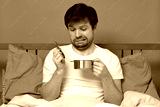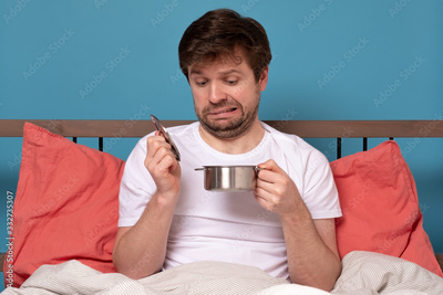 Sad man in bed eating a tasteless soup with a disgruntled look.