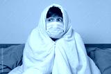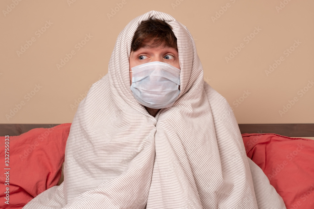 Sick mature caucasian man lying down in bed wearing mask protection mask