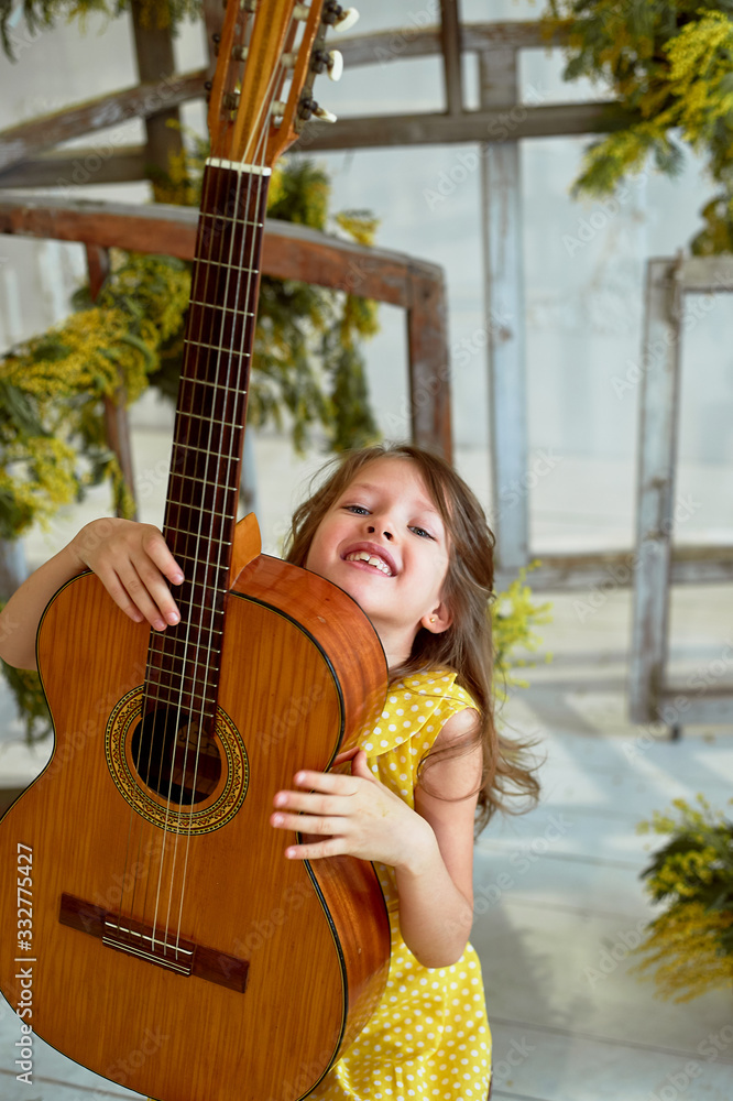 Girl, 6 years old. Her hair is loose. Yellow dress, Mimosa, beautiful interior. Laughing and holding a guitar. Music lesson.