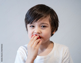 Portrait Healthy kid eating strawberries, Selective focus Hungry little boy looking at strawberry on his hand with smiling face, Child tasting fresh strawberry, Healthy summer food for Children