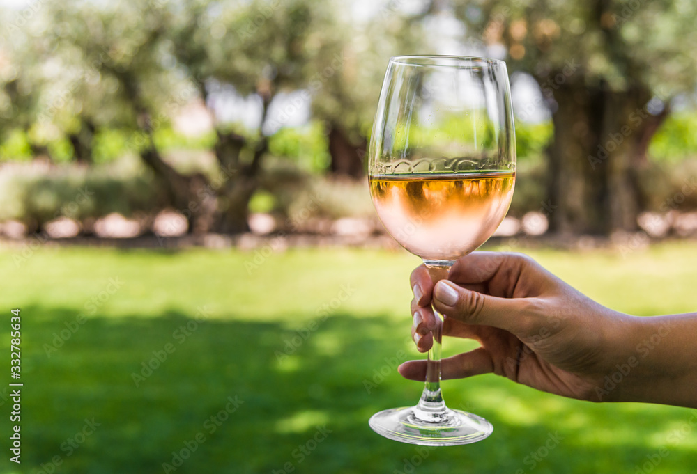 A young woman holding a glass of rose pink wine against the background of vineyard