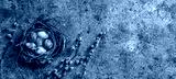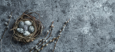 Marble Easter eggs in bird nest with feathers and spring flowers on blue background with napkin. Happy Easter holiday, top view, flat lay