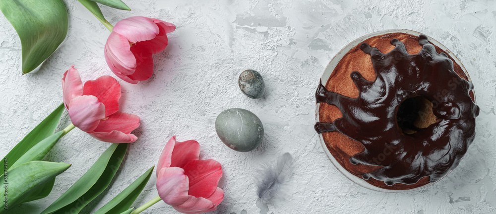 Easter cake with chocolate on white background with Easter eggs, nest and pink tulips flowers. Happy Easter holiday, top view