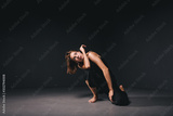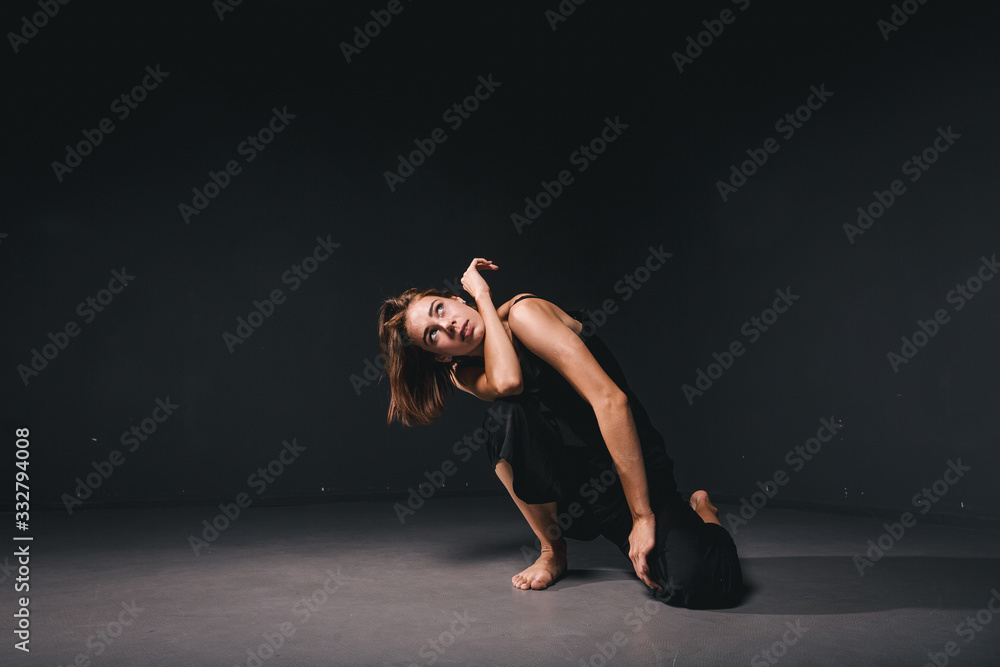 Portrait of a beautiful woman dancing on black background. Ballet and contemporary dancer dancing on dark backdrop. Contemporary Art. Plastic and flexible girl in black clothes posing on a black wall