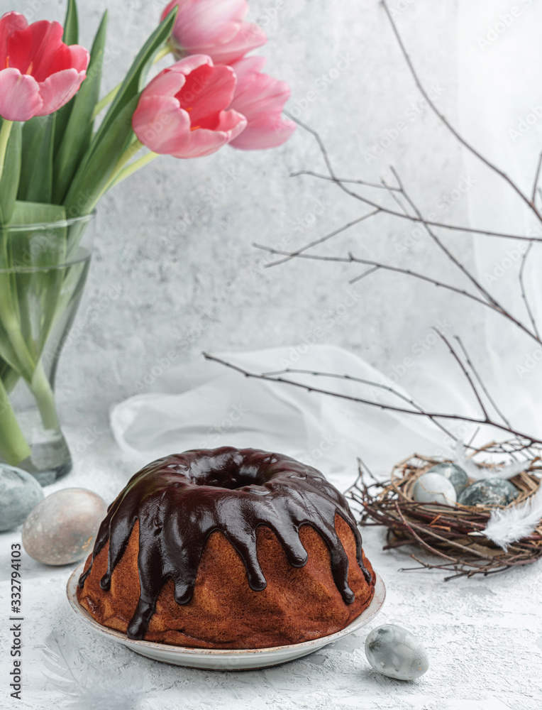 Easter cake with chocolate on white background with Easter eggs, nest and pink tulips flowers. Happy Easter holiday