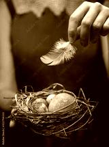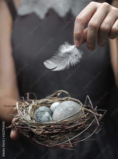 Woman hands holding nest with marble Easter eggs with feathers on dark background. Happy Easter holiday, selective focus