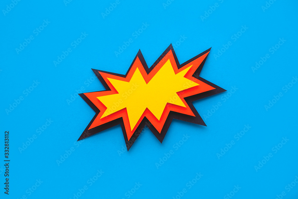 Handmade paper speech bubble on blue background. Cartoon and pop art style.