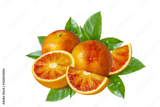 Isolated whole red Sicilian oranges and blood orange slices with green leaves on white background