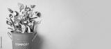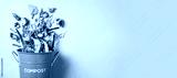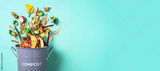 Peeled vegetables in white compost bin on blue background. Trash bin for composting with leftover from kitchen on blue background. Top view. Recycling scarps concept. Sustainable and zero waste