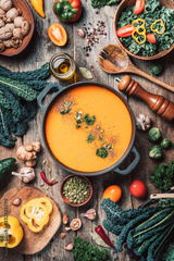 Vegan diet. Autumn harvest. Healthy, clean food and eating concept. Zero waste. Pumpkin soup with vegetarian cooking ingredients, wooden spoons, kitchen utensils on wooden background. Top view