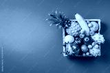 Rattan box full of exotic thailand fruits - pineapple, pitahaya, kiwano, african horned melon, tamarillo fruit, granadilla, feijoa, salak, snake fruits, maracuya, rambutan, lychee, longan, tamarind