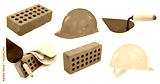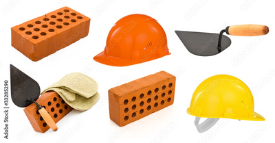ceramic brick, trowel, hard hats and gauntlet set isolated on wh