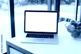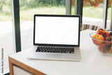 Laptop with blank white screen and fruits in glass bowl on countertop in modern kitchen with big windows, copy space. Culinary courses or recipe online concept. Cooking home concept. Food blog