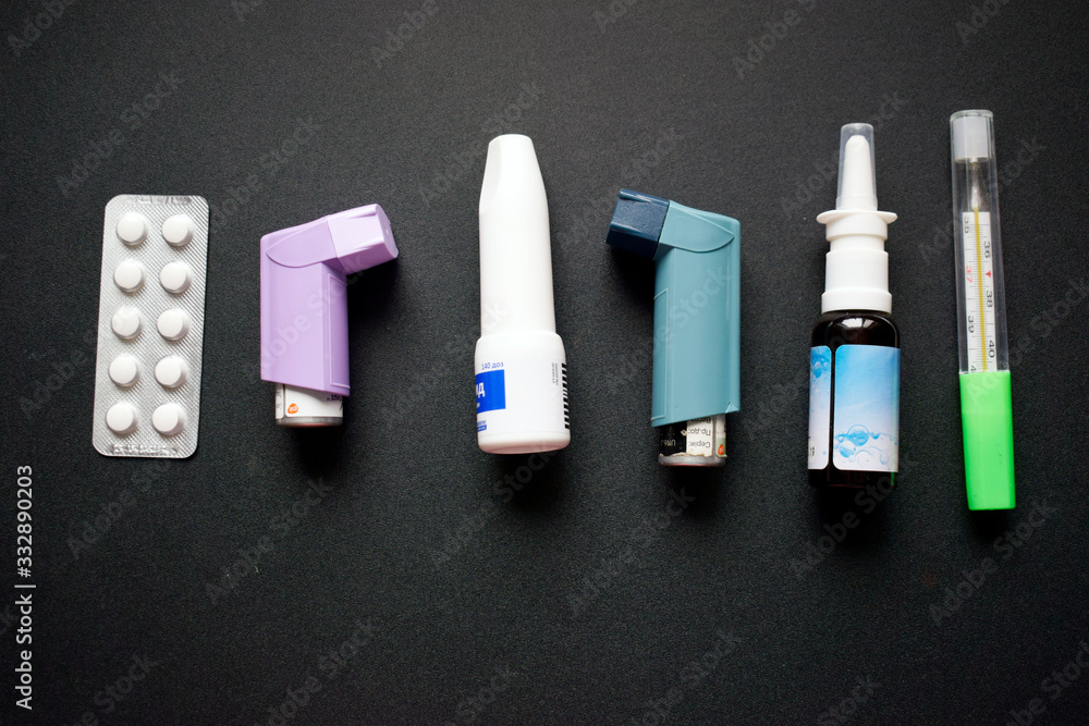 Kherson, Ukraine, March 25, 2020. Medicines, sprays and medications for treatment. Protective mask and thermometer.