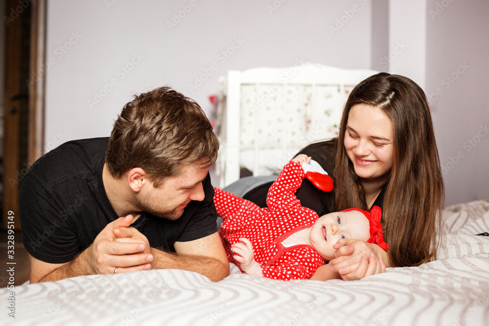 Parents and a newborn baby play at home. Red clothes. The concept of family, love, childcare and home.