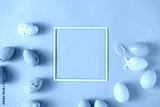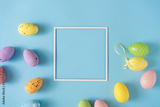 Easter layout made with colorful Easter eggs and pastel blue background. Minimal nature background. Spring holidays concept. Creative copy space. Flat lay.