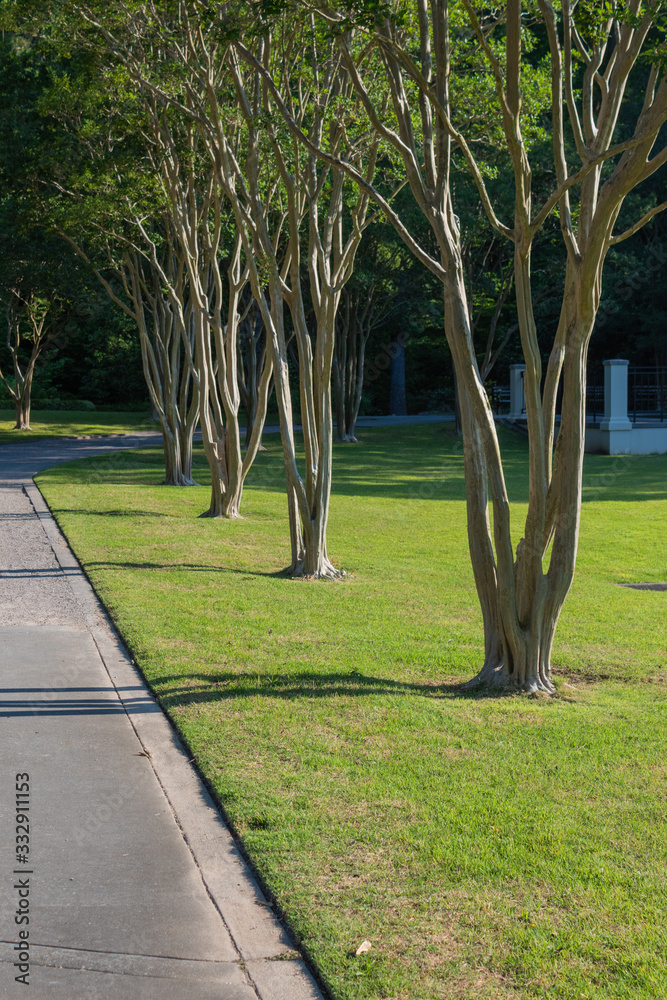 Crepe Myrtle trees along a walkway, grassy outdoor park landscaping, vertical aspect