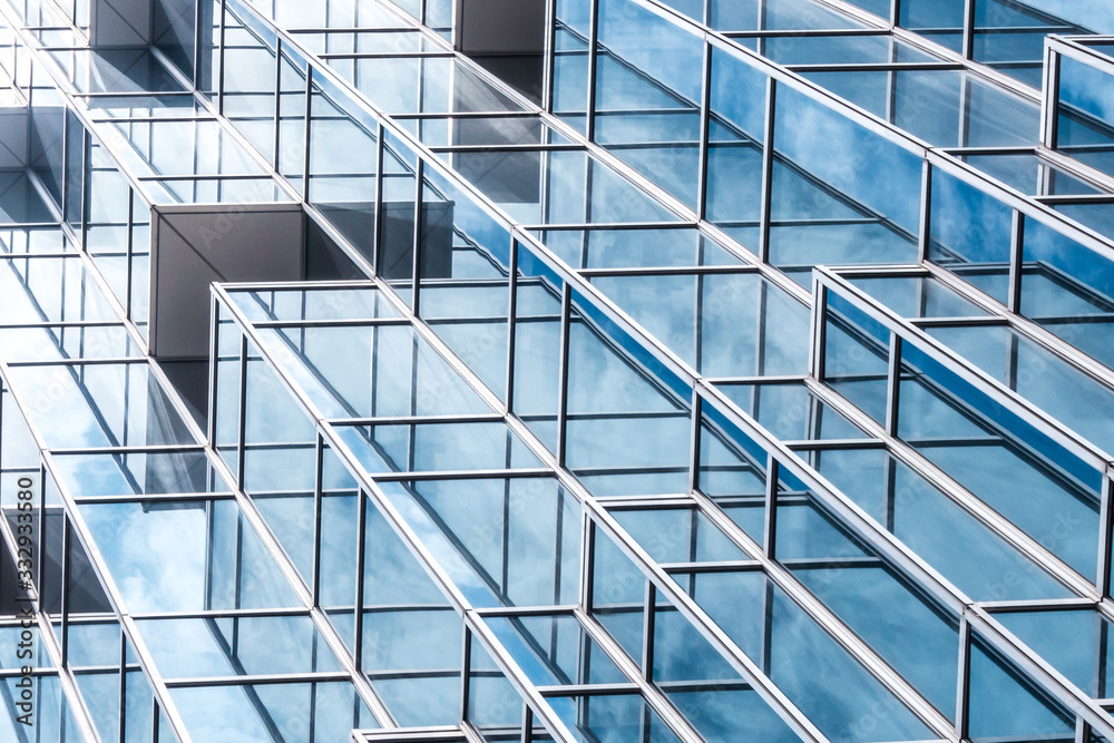 underside panoramic and perspective view to steel blue glass high rise building skyscrapers, business concept of successful industrial architecture