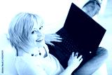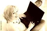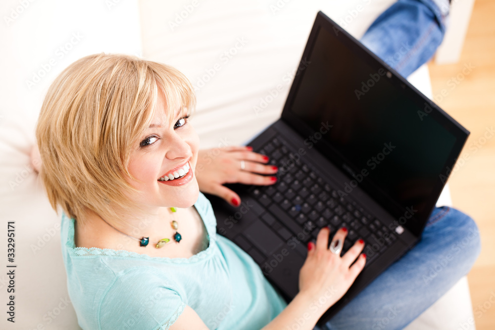 junge Frau mit Notebook, zu Hause auf Sofa sitzend