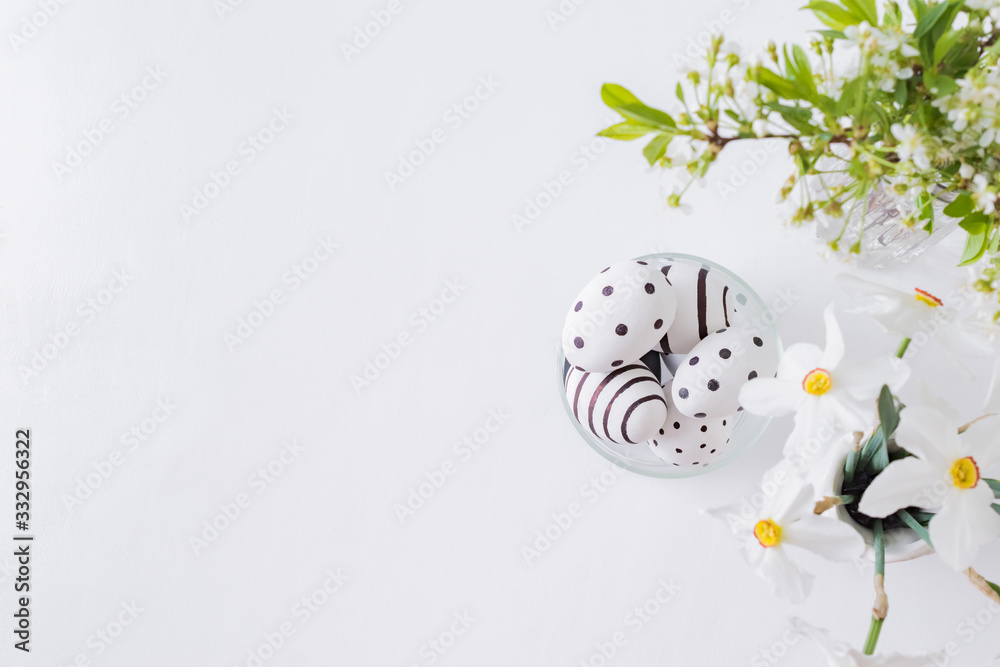 Flat lay easter composition with spring flowers in a vase and easter eggs on a light background