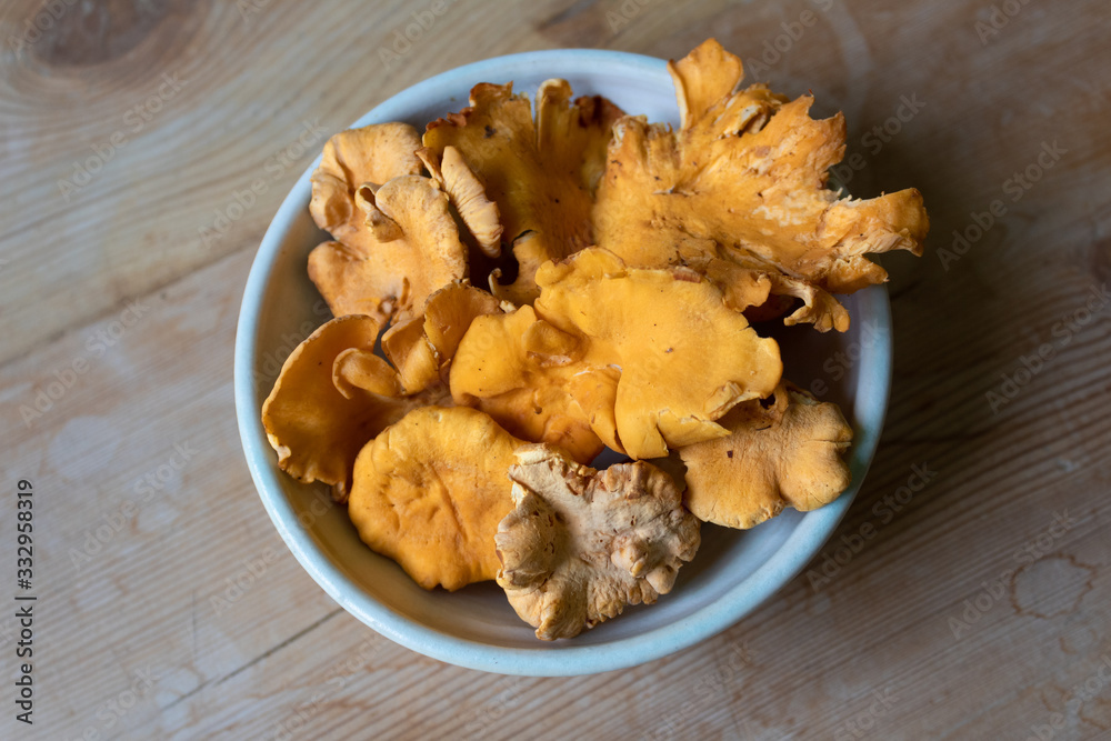 Centered bowl of meaty chanterelle mushrooms on a weathered wood table, horizontal aspect