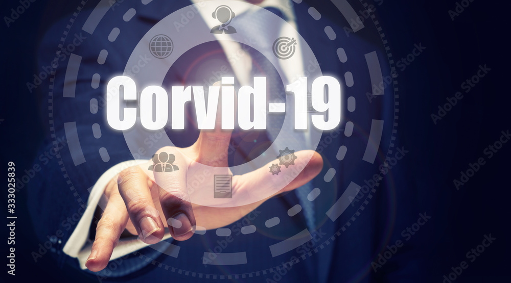 A mans hand pointing to a computerised display with a Covid-19 global virus pandemic message.