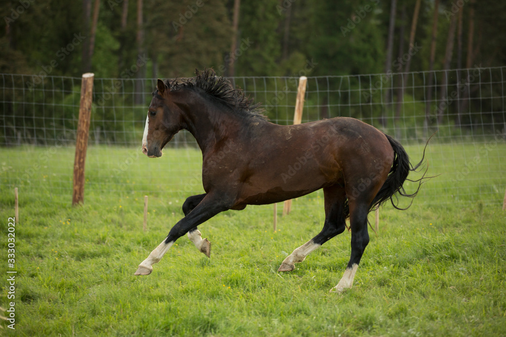 Brown horse runs in paddock with coniferous forest on background