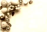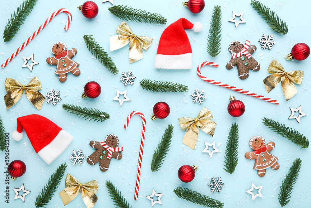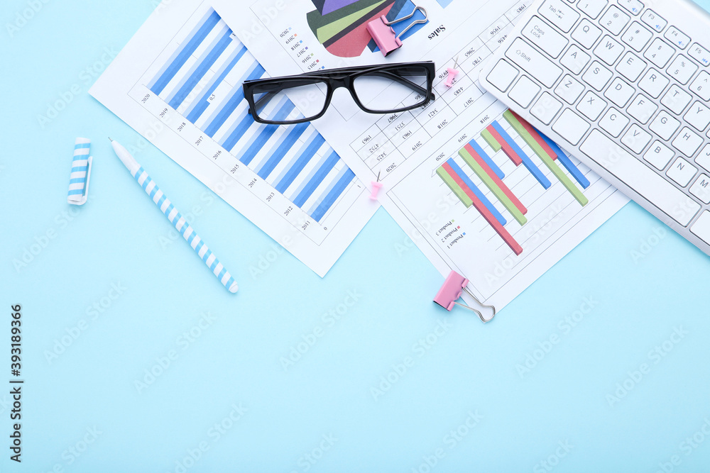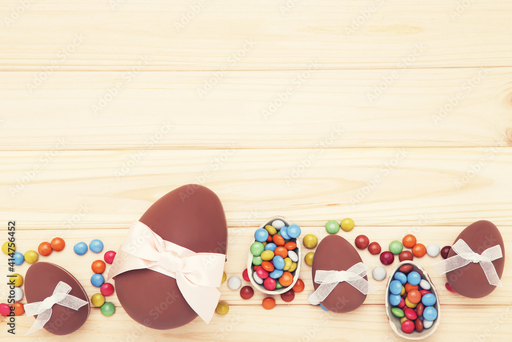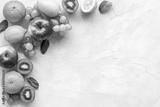 Fresh fruits background with citruses, apple, kiwi and grape on beige table top-down frame copy space