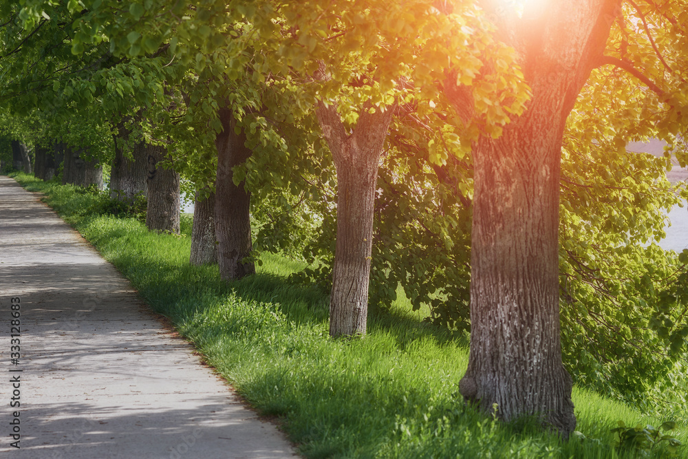 Beautiful alley in a public park on the sunshine on a sunny day. Nature spring landscape. Selective focus and blurred background.