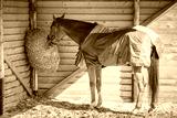chestnut budyonny gelding horse in halter and blanket eating hay from haynet in shelter in paddock