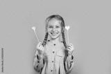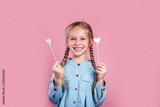 cute little girl holding two hear shapes pink with her hands wearing jeans denim shirt