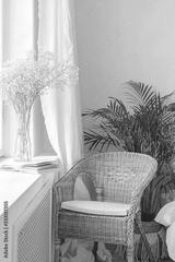 Cozy reading nook by the window with rattan wicker chair, green houseplant, delicate white flowers and opened book. Modern comfortable living room space
