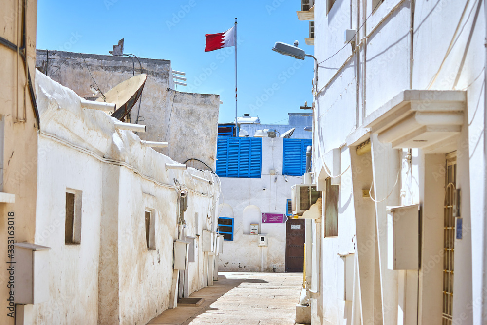 Narrow quiet arabian street in the old district of Bahrain with a national flag
