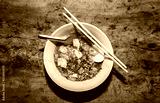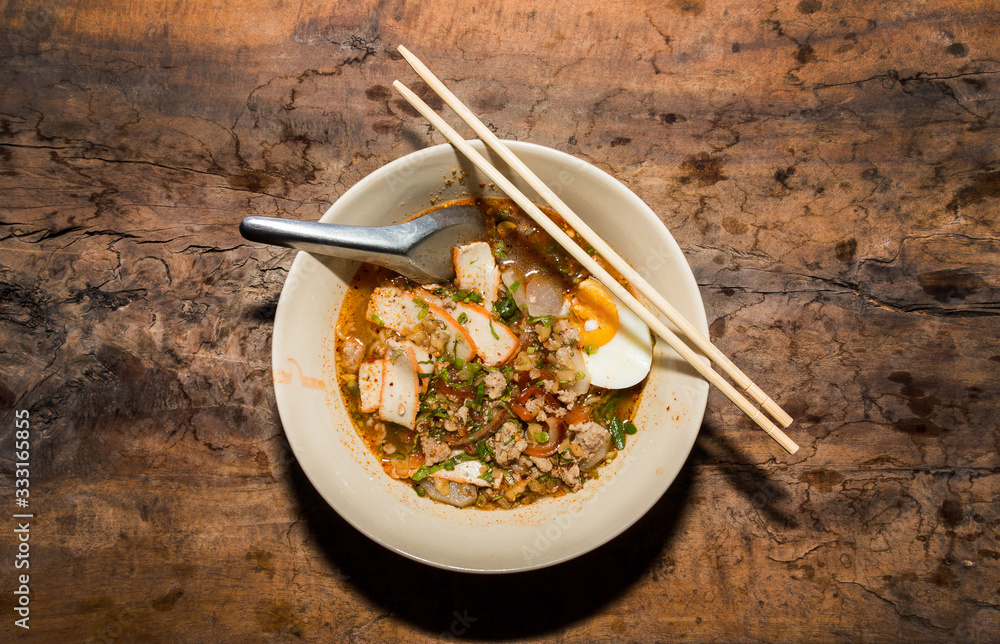 thai spicy noodle with pork and boild egg