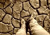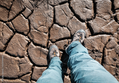 leg in hiking boots on cracked soil