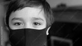 Close up kid face wearing medical face mask, Mixed race child boy with beautiful brown eyes looking at camera black face mask, Little boy stay at home during covid-19 lock down.