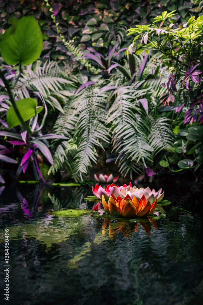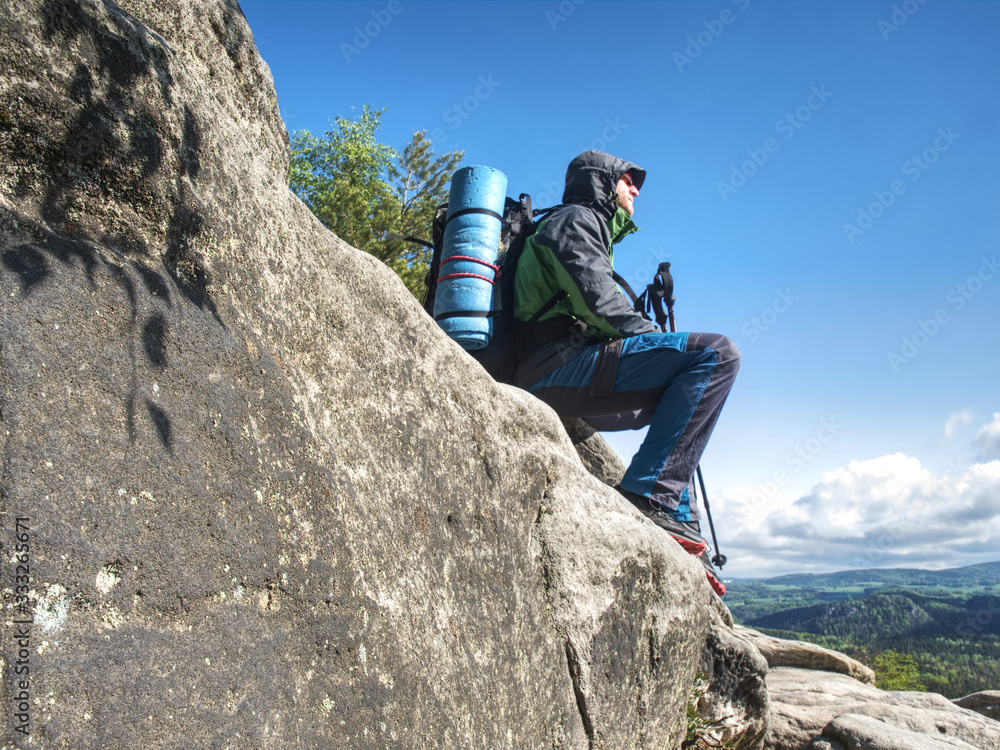 Hiker with camping sleeping pad on backpack. Man traveler sitting on rocky bench enjoying view