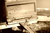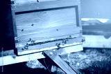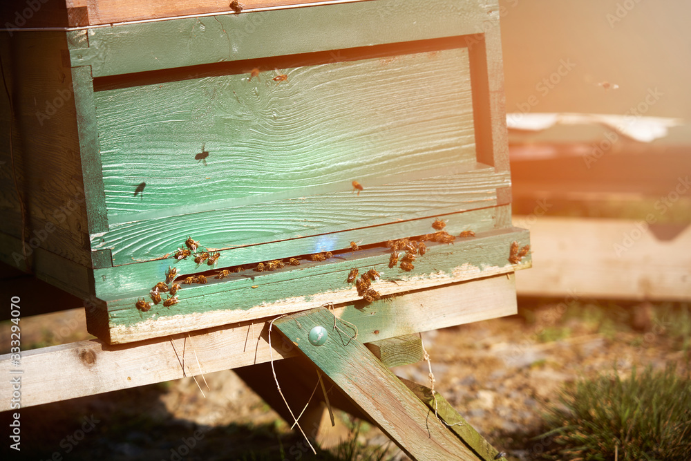 A side view of worker honey bees coming in and out of a beehive on a warm sunny day.