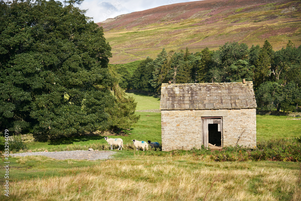 Sheep in green pastures on a hillside farm in the English countryside in spring. UK.