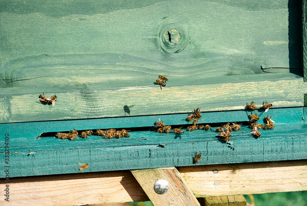 A close up of worker honey bees coming in and out of a beehive in the English countryside.