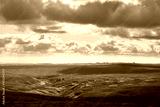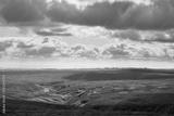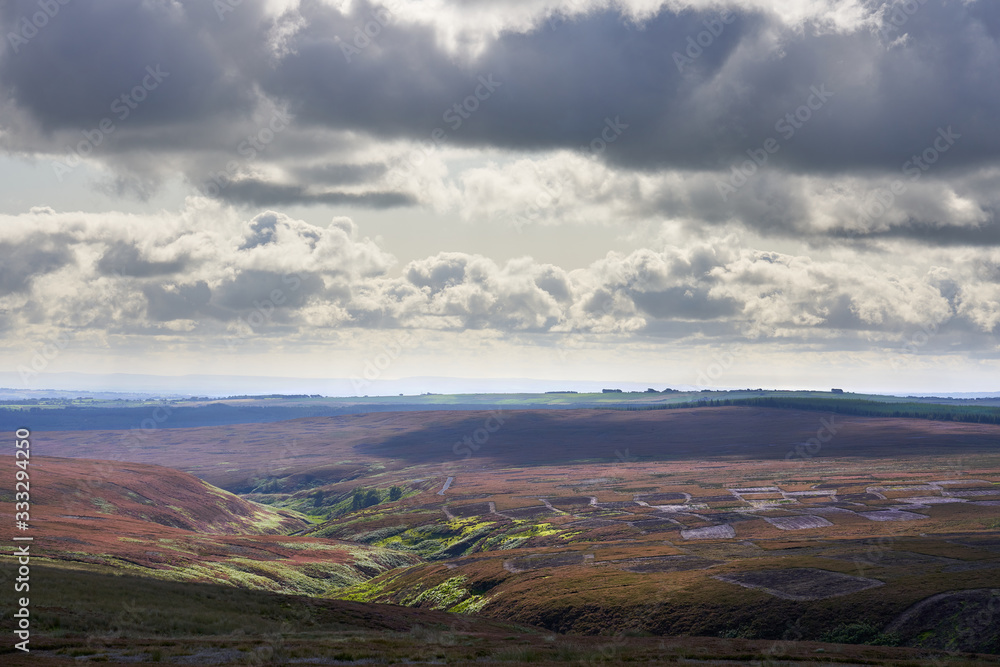 Distant moorland that has patches of burned heather as part of the land management for rearing grouse.