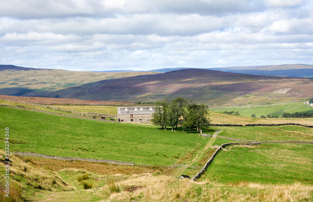 Stone farm buildings on farmland with the moors, common land, stretching out in the distance on a sunny day. Allotment House near the Folly Plantation, England UK.