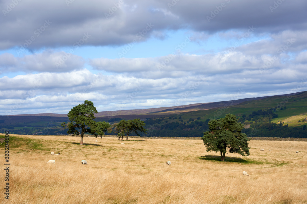 Sheep amongst the long dry brown grass of farmland in the English Countryside on a sunny autumns day.