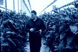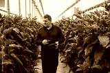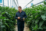 Male farmer harvesting eggplant in an organic eggplant greenhouse in Almeria